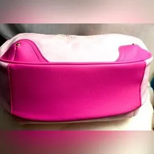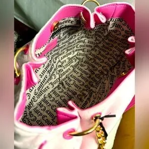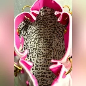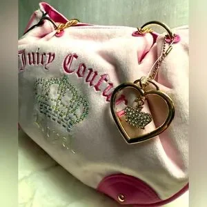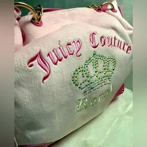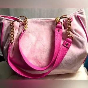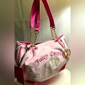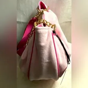 Bring back the Y2K era with this super cute tote in stunning pink velour! The tote features a trendy design on pink velour and faux leather, gold chain embellishments, and an embroidered Juicy Couture logo with crystals and crown charm. Has a magnetic button closure.
