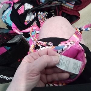Kenneth Cole Reaction size L. Vibrant bikini set with a mix of Feathers, floral and animal print patterns. Features a halter top and tie-side bottoms. Perfect for the beach, lake or pool.