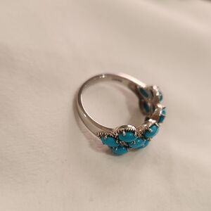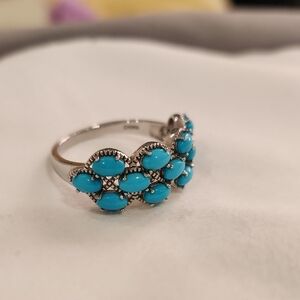 QVC Vibrant Geniune Sleeping Beauty Turquoise sterling silver ring featuring 3 rows of set prong turquoise stones band. Sleeping beauty turquoise is the most desirable turquoise available. In excellent pre-owned condition.
