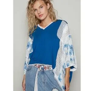 3596 Size Large “The Stephanie" Royal Blue Oversized High Low Top.V-neckline knit top, oversized fit, drop shoulder, print fabric, and see-through knit mixed well, frayed edge detailing throughout the garments. featured in Pol's jersey