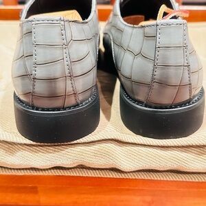 3 Monk Strap Dress Oxfords is one good looking shoe. You will certainly catch a lot of eyes with this one. These shoes has a great faux croc design and a wonderful dark blue patina on the toe, the shoe color is Gray. The outer sole is a non slip that is great for wet surfaces. These shoes are in excellent condition and it’s like new. L5 C