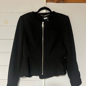 Chic black blazer with a peplum design. Features a front zipper closure. Perfect for professional and casual wear.