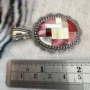 This Carolyn Pollack 925 sterling silver pendant showcases a vibrant multi-stone inlay design within an oval shape. The central inlay is composed of various materials, including mother of pearl, carnelian, and rhodochrosite, arranged in a mosaic or geometric pattern with shades of red, pink, white, and subtle yellow. The oval centerpiece is framed by a distinctive sterling silver border with a rope-like or braided texture, and the large bail at the top is also crafted from sterling silver with a similar intricate design, allowing for easy wear with various chains or native pearls.
