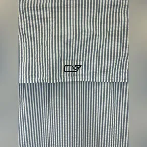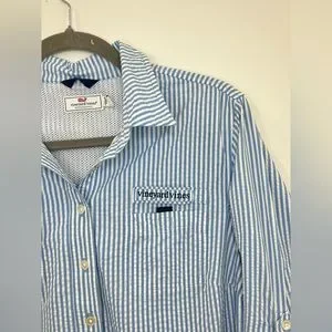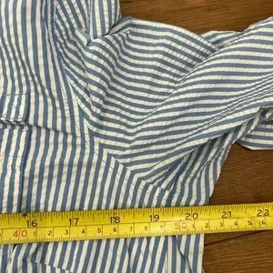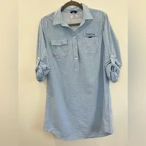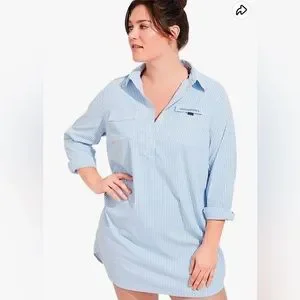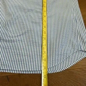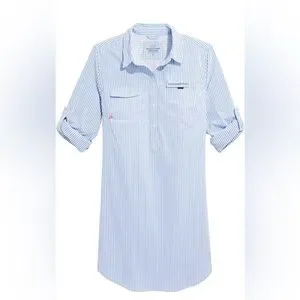 Stylish blue striped coverup. Features roll-up sleeves. Perfect for beach days.