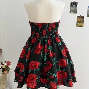 Chic mini dress with vibrant red floral print. Strapless design with ruffled neckline. Perfect for stylish outings.