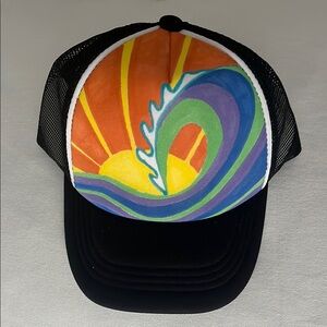 Vibrant adjustable trucker hat with wave and sun design. Features orange, yellow, green, and purple colors.