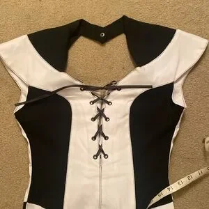 16 flat across, waist 12.75, hips 15.5, length 42 shoulder to hem, stretch fabric, snaps at neck. Corset lace up front. Worn once for photos.