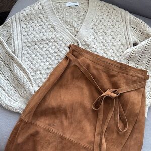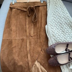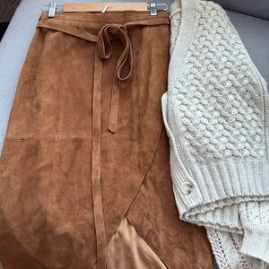 Chic suede midi skirt with wrap design. Features a tie waist for a custom fit. Perfect for versatile styling.