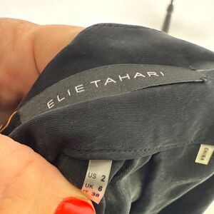 Elie Tahari black 100% silk aline knee length skirt. Size 2; waist 12.5". Cute vertical ruffle detail; side zipper.