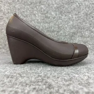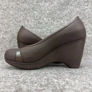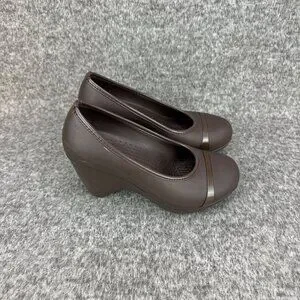 ✅Womens 7W Crocs Lena Cap Toe Wedge Brown Slip-On Heel Pumps Casual Comfort Shoe