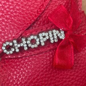 This Chopin Roma Pebbled Dachshund Dog Handbag is a unique crossbody purse in a dog-shaped design, perfect for casual occasions. Made from faux leather with a pebbled exterior finish, this medium-sized bag features a red crossbody strap and metal hardware. The distinctive dachshund theme adds a playful touch to the stylish and functional handbag, making it a charming accessory for any dog lover. It features rhinestone studded collar. Inside of bag is clean but there is some glue residue on the interior lining from me gluing the loose liner on the interior base. See photos for more details on condition.