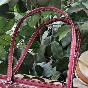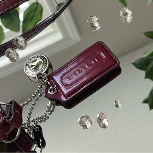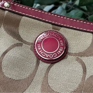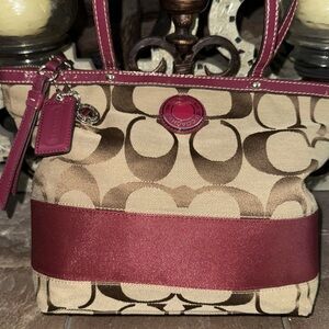 Stylish Coach shoulder bag with signature canvas. Features a bold red accent. Perfect for everyday use.