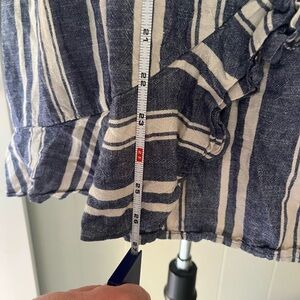 Stylish mini dress with vertical navy and cream stripes. Features a halter neckline and side tie accent. Ideal for casual wear.
