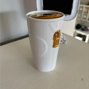 Starbucks Ceramic Mug with Gold Zipper and Lid Accents