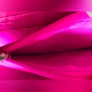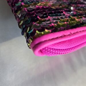 Eye-catching wristlet with vibrant sequins. Features a pink wrist strap and secure zip closure. Ideal for parties.