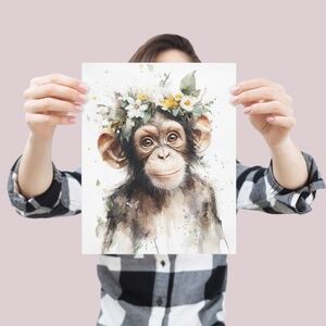 Bring a burst of playful elegance to your home with this Watercolor Monkey Portrait with Flower Crown Wall Art Print. This unframed print showcases a delightful watercolor illustration of a monkey adorned with a vibrant flower crown, blending jungle charm with bohemian flair. Perfect for boho, eclectic, or modern interiors, this artwork adds a whimsical yet sophisticated touch to living rooms, nurseries, bedrooms, or offices. Printed on premium archival-grade paper, it ensures vivid colors and lasting durability. Available in multiple sizes, this print pairs effortlessly with your favorite frame for a custom look. Infuse your space with the joyful spirit of nature with this enchanting monkey portrait!