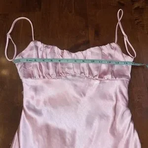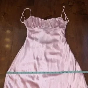 Stunning pink satin gown with delicate straps. Perfect for formal occasions.