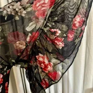 Elegant off-shoulder sheer top with a floral pattern. Features red and green hues on a black background. Slightly used. Smoke & Pet free home