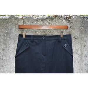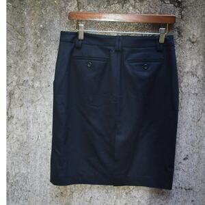 Classic and sophisticated, this Theory “Donna” skirt in black Tailor fabric offers a sleek pencil silhouette with modern detailing. Features angled front pockets with button flaps, back welt pockets with button closures, belt loops, and a hidden front zip with button closure. Fully lined for comfort and shape retention. Perfect for professional wear, formal occasions, or pairing with a casual blouse for an elevated everyday look. Brand new with tags.
