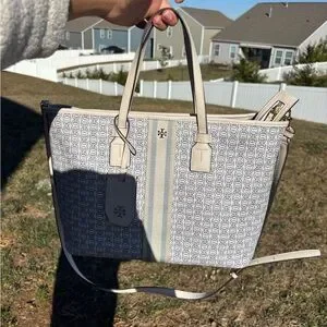 Stylish Tory Burch tote. Features gray pattern with cream accents. Perfect for everyday use.