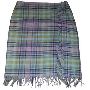 A fringe-trimmed overlay and an asymmetric front vent give this plaid skirt the look of a wrap skirt, but it’s an easy-to-wear pull-on style. The classic pattern and mix of colors make the perfect match for your favorite sweaters, tops and jackets, including denim. Invisible side zipper with single-button closure. Fringe trim all around the hemline. Back darts. Lined.