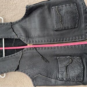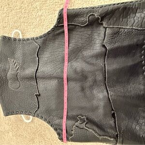 Stylish black leather vest with intricate stitching. Perfect for adding a rugged touch to any outfit.