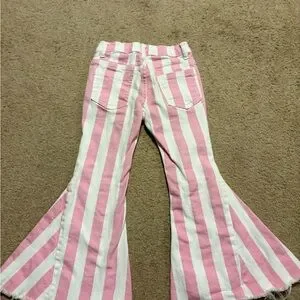 Stylish pink and white striped flare jeans for a bold fashion statement. Perfect for adding a pop of color to your wardrobe. They have a small stain on left knee that has not been treated. Button and zipper in perfect condition. Make me an offer!!