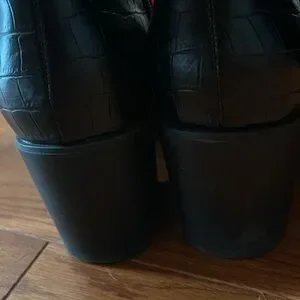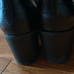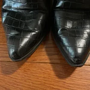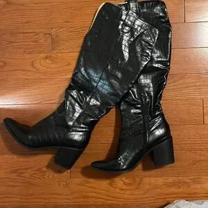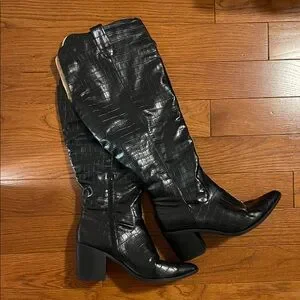 Step out in style with these chic black croc-embossed knee-high boots. Perfect for adding a touch of elegance to any outfit.