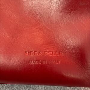 Make a bold statement with this Vera Pelle Italian leather handbag, crafted in vibrant red with contrasting black handles and a front buckle detail. This structured satchel-style bag combines elegance and edge with its sleek shape and high-shine finish. Features dual handles and a secure top closure. Made in Italy from genuine leather. In great pre-loved condition with minimal signs of wear.