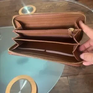 Elegant brown leather wallet. Features gold logo detail. Sleek and stylish design.