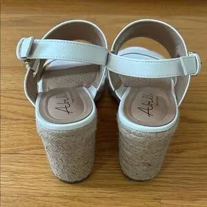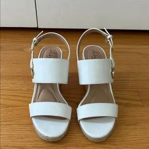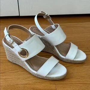 Fun white wedges with a 3.5" tan woven heel. Gold hardware add a unique touch. Cushioned sole for comfort. Worn once.