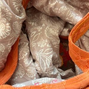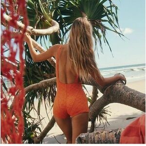 Stylish orange one piece with floral pattern. Features a unique cut-out design. Perfect for beach days.