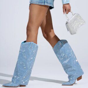 Crystal-covered denim foldover western boots that blend rhinestone rodeo glam with Y2K-inspired street style.