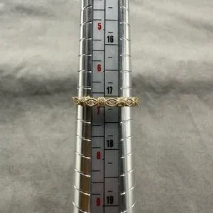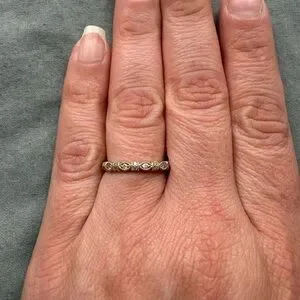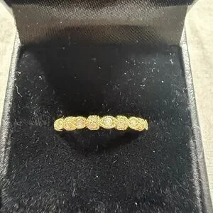 Vintage inspired 10K yellow gold and diamond band. Super cute and easily stacks to complete your look. Size 7. All stones intact. Normal wear for a pre-loved item. Unfortunately no returns accepted.