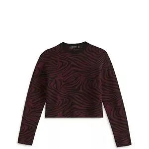 Elevate your style with this chic zebra print jacquard sweater from Ted Baker. Featuring a striking black and burgundy pattern, it's perfect for any occasion. Pair it with your favorite jeans or a black maxi for a trendy look.