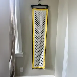 Elegant scarf with bold polka dot design. Features vibrant yellow border and black dots on white background. Perfect for adding a chic touch to any outfit.
