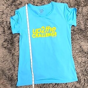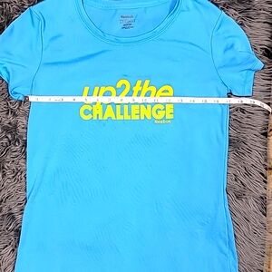 Stay stylish and comfortable with the Reebok Women's Blue T-Shirt. Perfect for workouts, around the house, errands, and more! This top features a vibrant blue color and a motivational 'up2the CHALLENGE' print. I bought this at a Crossfit event years ago! I never wear it so time to list it!