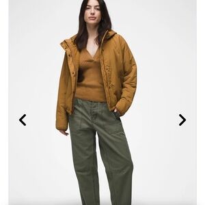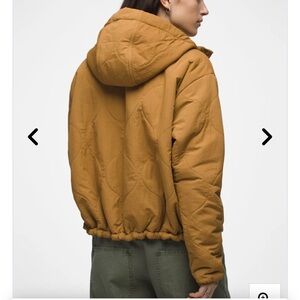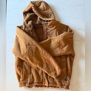 Stylish tan bomber jacket. Features a cozy hood. Perfect for cold weather.