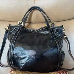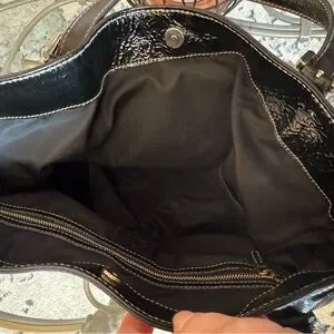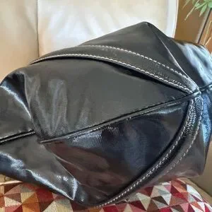 It is made of "dialux" which is shiny coated twill with patent leather trim and handles. This beauty has a roomy interior and a convenient removable shoulder strap.
