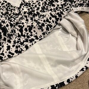 This elegant blouse features a striking black and white pattern with a flattering ruched design. The flutter sleeves and notched collar add a touch of sophistication, making it perfect for both casual and formal occasions.