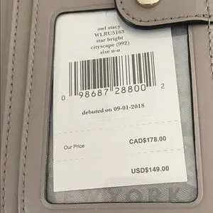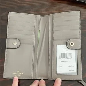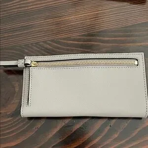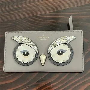 NWT. Kate Spade gray wallet with unique owl design. Features sparkling embellishments and zipper pocket on the back.