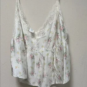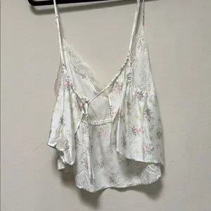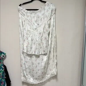 Charming floral skirt set by Aerie. Features delicate pink flowers on a cream background. Includes a flowy skirt and matching top. Perfect for a casual day out.
