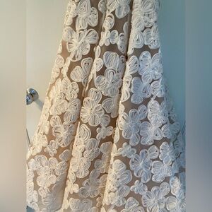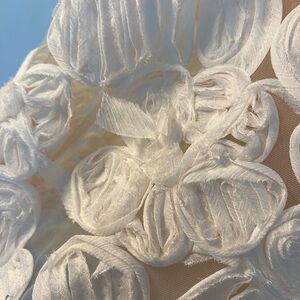 There are a few flowers throughout on the skirt of the dress that have the fabric sticking out a little (see photos for example). Please let me know if you need any measurements!