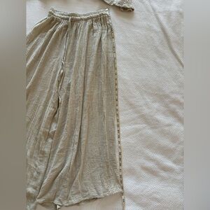 Relax in style with this elegant sleepwear/ lounge set. Flowy pants and flowy tank. Fits medium but flexible sizing with flowy style and elastic waist. Color is a beige - sage. No label, bought in Thailand.