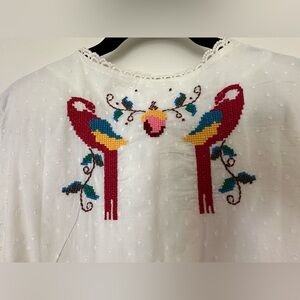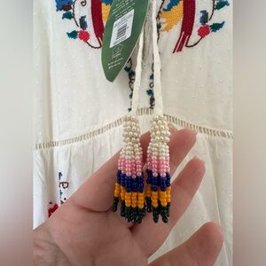 Crafted of textured cotton, Farm Rio's Macaw dress is decorated with vivid cross-stitch embroidery. This breezy piece features geometric lace detailing, and a hand-beaded fringe drawstring closure at the neck.
