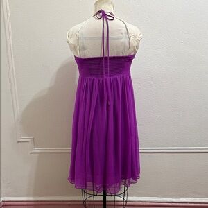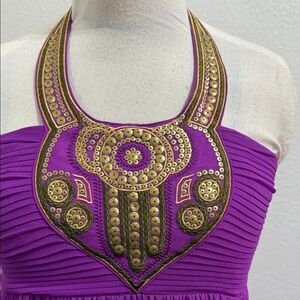 Elegant purple midi dress. Features halter neckline with intricate embellishments. Perfect for special occasions. Pre-owned.