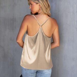 Cream V Neck Satin Babydoll Blouse With Sheer Top Accent & Adjustable Straps M