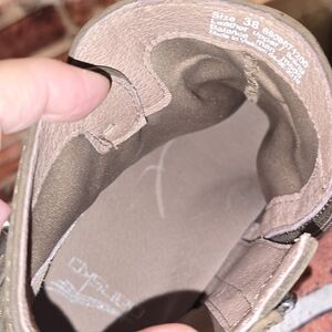 Step out in style with these chic brown Dansko ankle boots. Perfect for any occasion, these boots offer both comfort and sophistication. Wege heel. Decorative buckle. Leather upper, man-made lining, rubber sole.There is some wear on the toe portion that is normal for nubuck. Size 38.