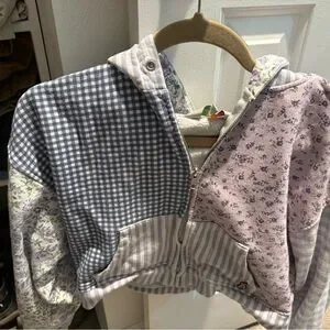 Crop jacket has a bit of wear to it. Strings missing at top of hoodie. Refer to photos for reference.