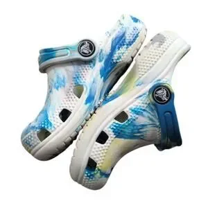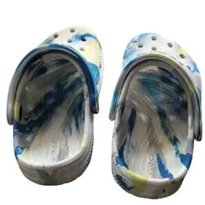 Fun and colorful Crocs for toddlers featuring a playful blue and yellow paint splatter pattern. Lightweight, comfortable, and easy to clean — perfect for everyday wear, water play, or outdoor adventures. Ventilation ports for breathability and water drainage, plus a heel strap for a secure fit.